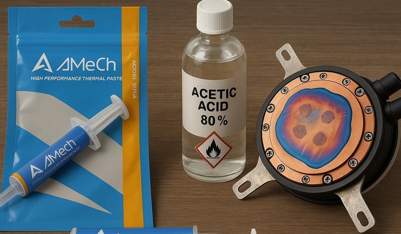 Речь идёт о термопасте SGT-4 южнокорейской компании Amech, которая, по данным эксперта и основателя IgorsLab Игоря Валлоссека, содержит нестабильное и агрессивное химическое соединение, разрушающее металлические поверхности ЦП и кулеров.