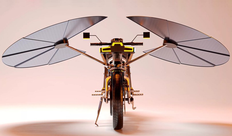 Главная особенность Solaris — выдвижные круглые солнечные «крылья». Когда мотоцикл стоит на парковке, они раскрываются над ним подобно тенту, увеличивая площадь солнечного сбора почти на 150% по сравнению с классическими панелями. Полученная энергия накапливается во встроенном литиевом модуле.