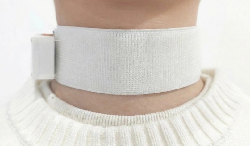 Revoice — это не имплант и не сложный медицинский аппарат, а мягкое носимое устройство, похожее на регулируемый текстильный чокер. Его надевают на шею, и он помогает «переводить» беззвучно произнесённые слова в полноценную, эмоционально окрашенную речь. Идея проста: если мозг по-прежнему формирует намерение сказать фразу, почему бы не считать эти сигналы напрямую с мышц горла?