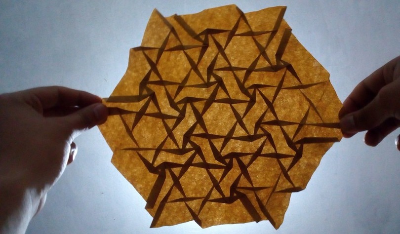 В первом случае «оригами» реагирует на влажность. При повышении уровня влаги сложенные элементы раскрываются, а при высыхании — снова закрываются. Это обратимое движение позволяет использовать материал как актуатор, полностью питаемый окружающей средой. По сути, воздух с нужной влажностью заменяет электропитание.